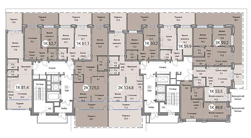 На каждом этаже новостройки расположено около 5 квартир. Это очень хорошие показатели для Новосибирска, свидетельствующие о комфортной площади квартир и ориентации на постоянный состав жителей дома. Такая поэтажная разбивка соблюдает правильный баланс: многокомнатные жилые помещения представлены в необходимом количестве, нет перекоса в сторону 1-комнатных квартир и студий.
