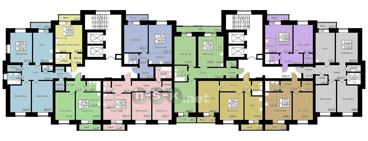 На каждом этаже новостройки расположено около 5 квартир. Это очень хорошие показатели для Новосибирска, свидетельствующие о комфортной площади квартир и ориентации на постоянный состав жителей дома. Такая поэтажная разбивка соблюдает правильный баланс: многокомнатные жилые помещения представлены в необходимом количестве, нет перекоса в сторону 1-комнатных квартир и студий.
