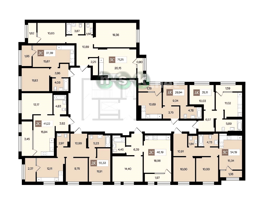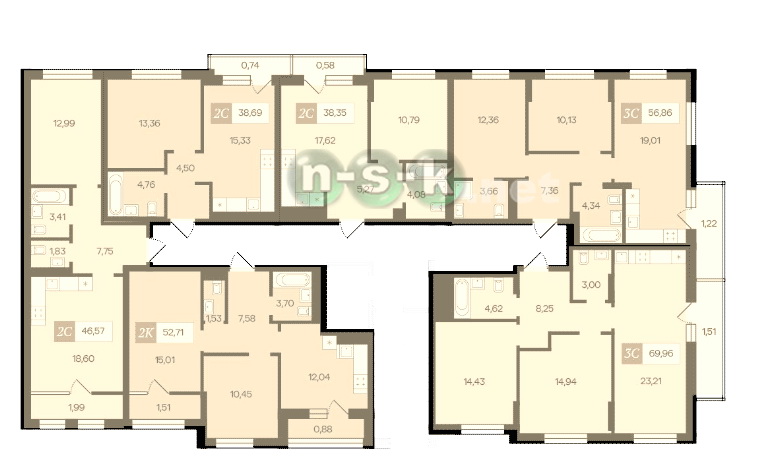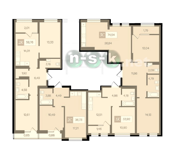 На каждом этаже новостройки расположено около 7 квартир. Это очень хорошие показатели для Новосибирска, свидетельствующие о комфортной площади квартир и ориентации на постоянный состав жителей дома. Такая поэтажная разбивка соблюдает правильный баланс: многокомнатные жилые помещения представлены в необходимом количестве, нет перекоса в сторону 1-комнатных квартир и студий.